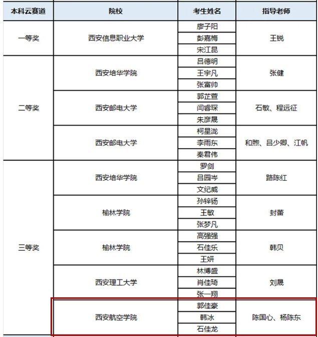 近日,由华为技术有限公司主办,宇信教育协办,中建信息赞助,软通动力、泰克教育及讯方技术协办的华为中国大学生ICT大赛2021实践赛陕西省决赛圆满落幕。本次比赛共有来自全省28所高校216名学生参加了总决赛。经过激烈比拼,我校由beat365陈国心、杨陈东老师指导的郭佳豪、韩冰、石佳龙学生团队,最终荣陕西赛区本科云赛道“三等奖”,王苗苗、单文娟老师指导的刘晓伊、杨雨、张轩睿学生团队荣获“优胜奖”。