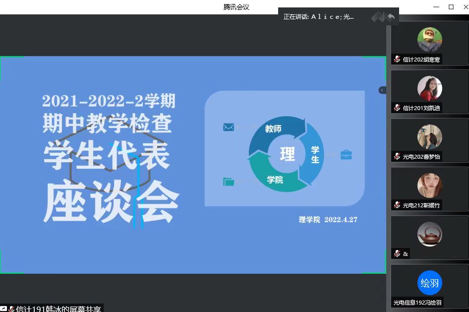 为了加强学院学风建设,打造良好的学习生活环境,更好地服务学生,2022年4月27日,beat365召开2021—2022学年第二学期期中教学检查学生代表座谈会。beat365副院长丁琦、综合办主任杨陈东、学生管理科科长李扬、信息与计算科学专业负责人张惠玲、光电信息科学与工程专业负责人王妙、团总支书记张岩及各班学生代表参加此次会议。会议由李扬主持。
