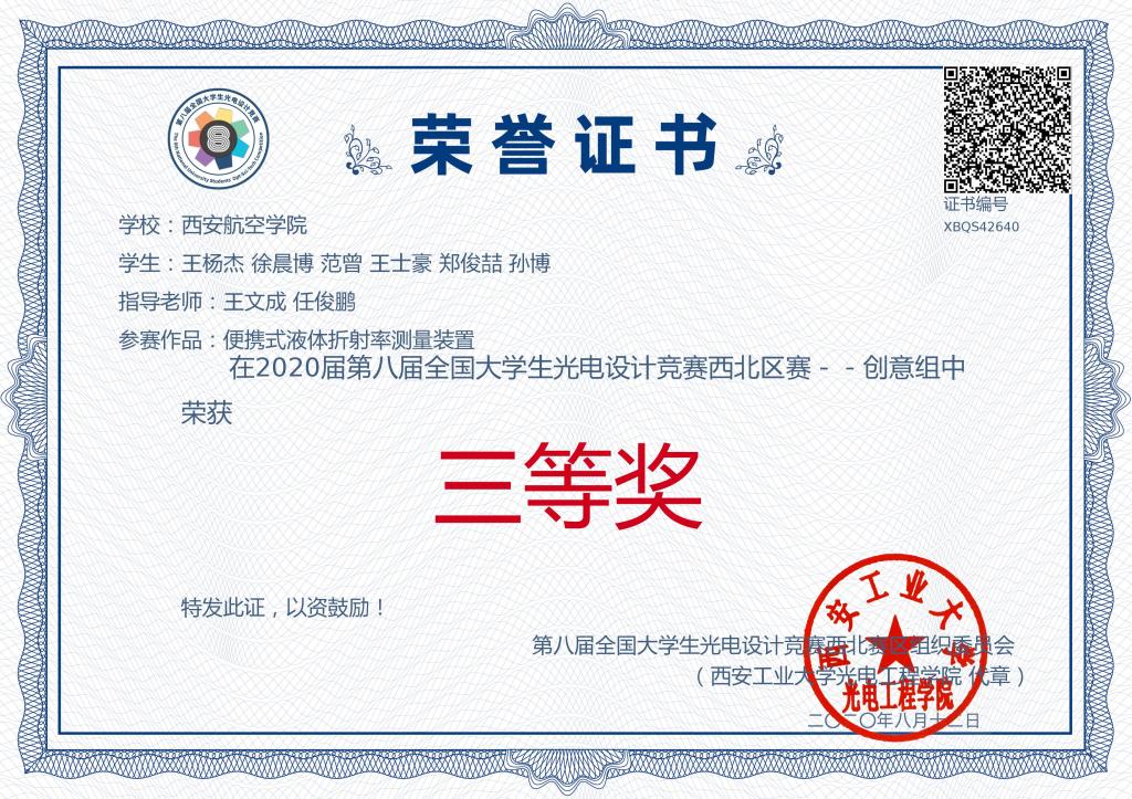 2020年8月10日,第八届全国大学生光电设计竞赛(西北赛区)在西安工业大学落下帷幕,共有来自西安交通大学、西北工业大学、西安电子科技大学、兰州理工大学、宁夏大学等西北五省16所高校的141支队伍报名参赛。我校是首次参加该项全国性光电竞赛。经过线上评审初赛,共有57支参赛队伍获得路演决赛资格,我校beat365王文成、任俊鹏老师指导光电信息科学与工程专业6名本科生组成的“追梦”团队荣获西北赛区三等奖。