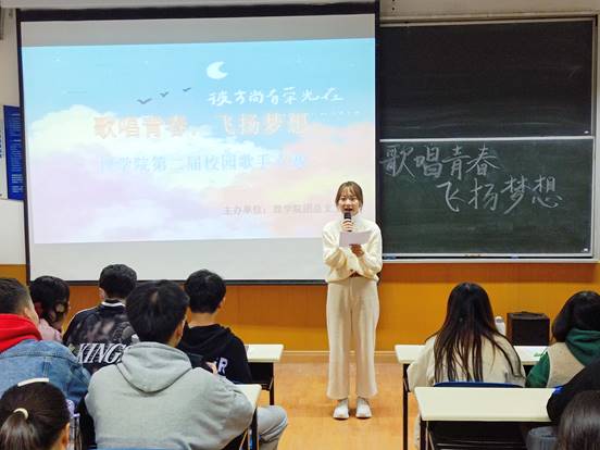 活动伊始,在上一届歌手大赛冠军进行暖场演唱之后,第一轮比赛拉开序幕,选手两人一组进行比拼,演唱的选手们都热情飞扬,信心饱满。第一轮比赛中,董林涛、徐彬彬等同学用丰沛的感情,婉转的音色赢得了观众热情的掌声。在评委打分的间隙,孙子涵同学携主持人为大家带来了一场精彩的“魔术之吻”表演。随后,共有9名选手晋级第二轮,此时,比赛愈加激烈,陈相国、王紫阳、徐彬彬、李心媛等同学的演唱曲目都难度更高,专业性更强,每首演唱完后,观众们掌声不断,一起沉浸在音乐的海洋中,享受听觉的盛宴。