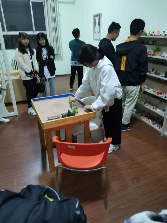 随后,李扬老师带领大家逐个参观了预约等候室、个人心理咨询室、沙盘心理放松室等房间,并就其功能定位进行说明。为了让大家更直观感受到心理放松室的魅力,安老师让同学们摆放沙盘并且说明介绍了其功能和魅力所在,并且还向同学们介绍了音乐按摩椅,从细微之处让大家感受到了心理咨询的专业性与魅力。
