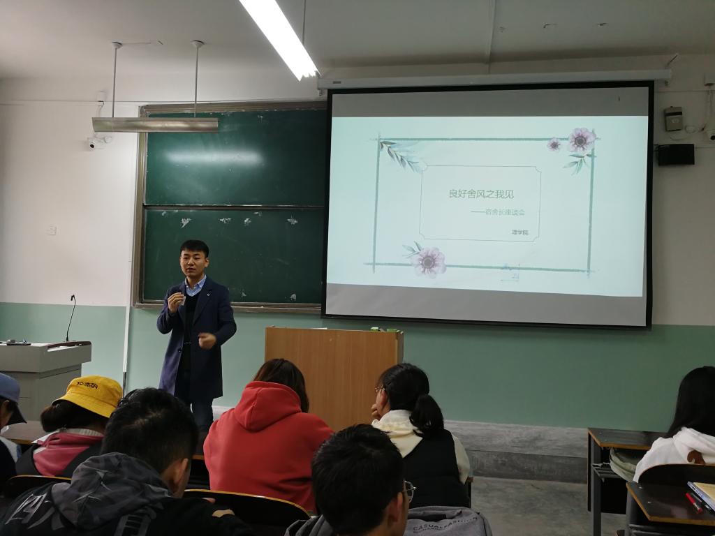 2019年11月7日,beat365全体宿舍长在主楼0308召开座谈会,会议由团总支书记、辅导员杨陈东主持。本会议旨在进一步提升宿舍卫生和文化建设,营造更加美好的宿舍环境。