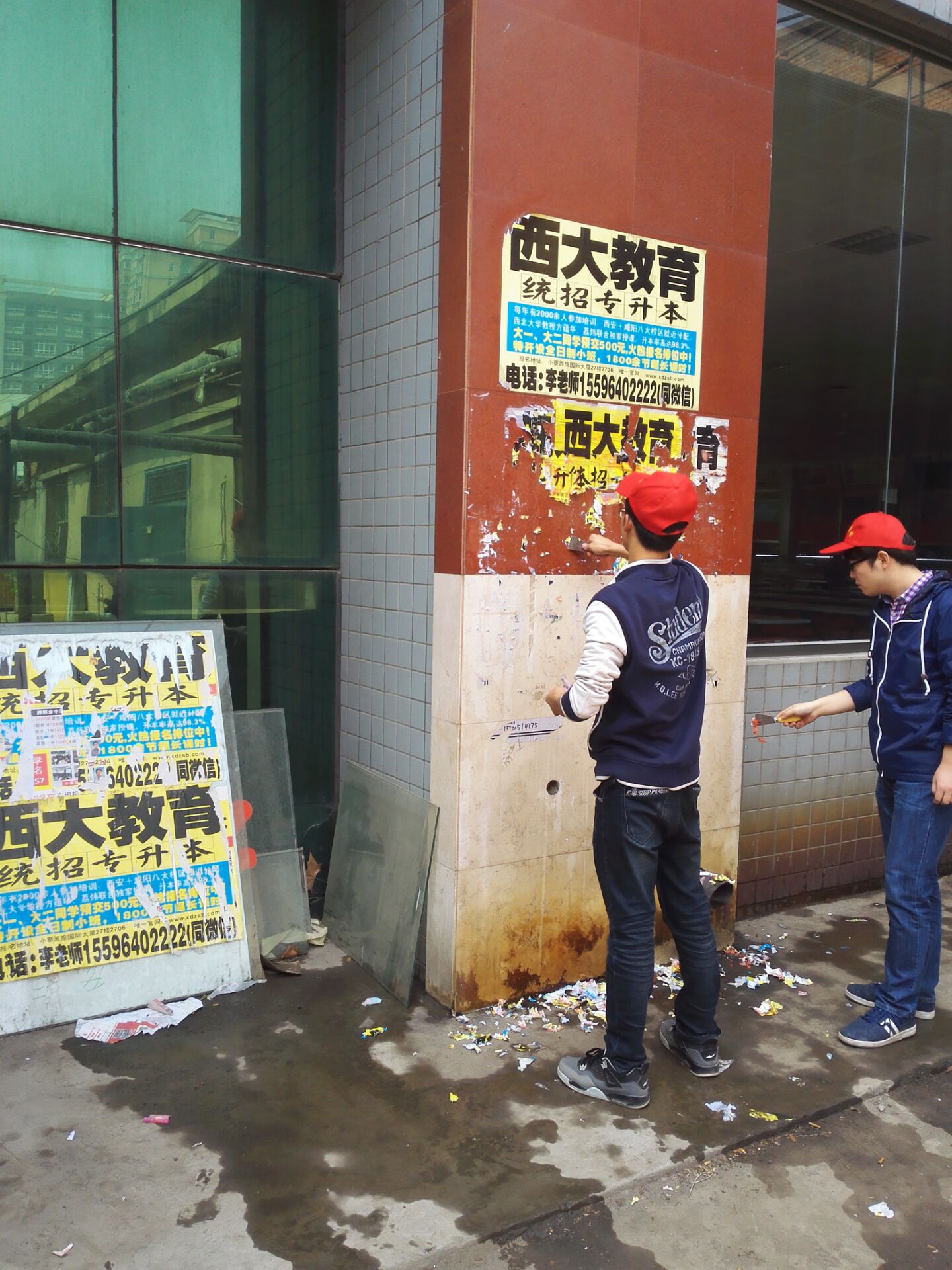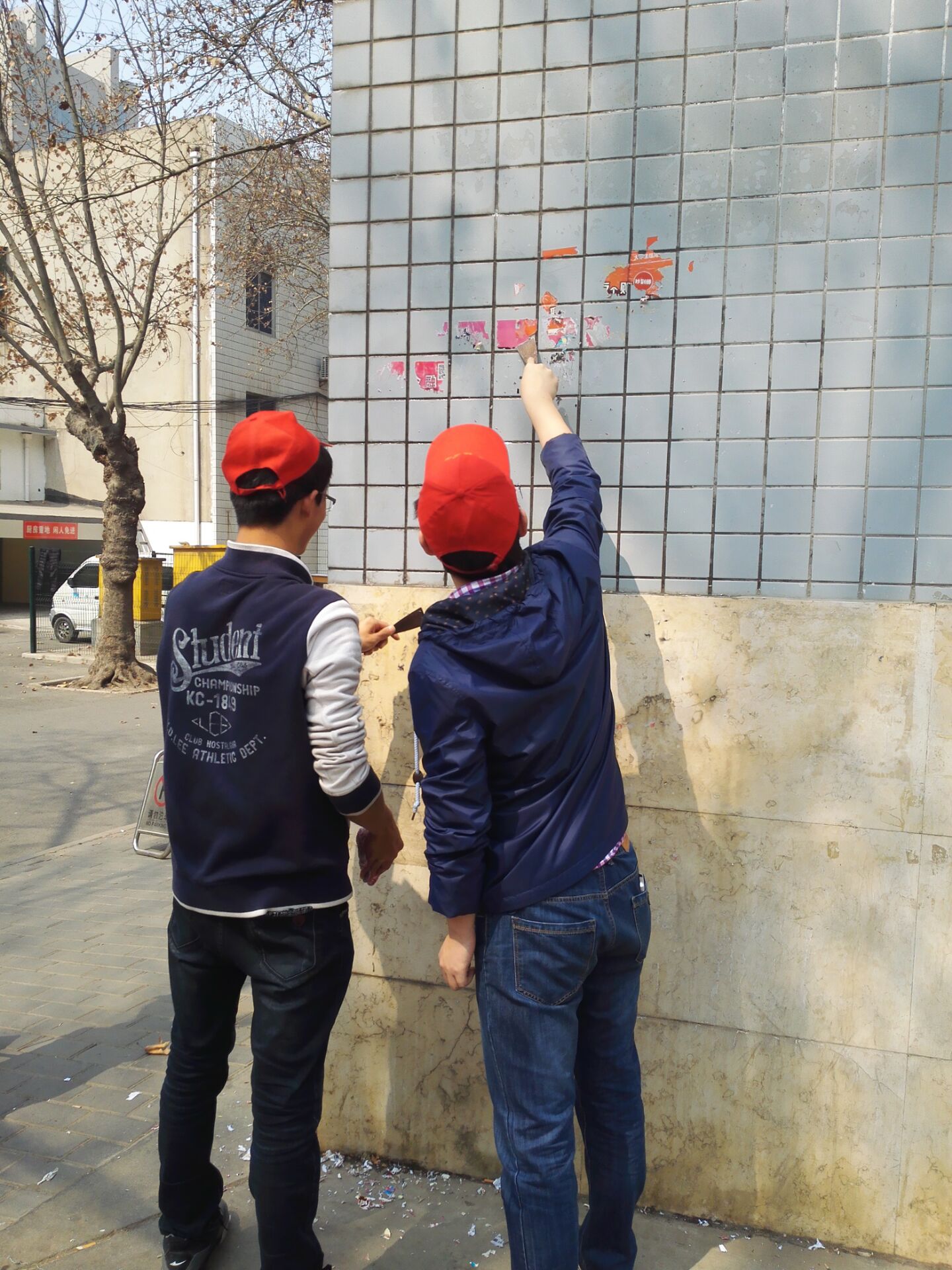 下午1点,参加本次活动的beat365志愿者们在学校一号食堂门口集中,由校方清点人数并领取活动工具。之后,在beat365青年志愿实践活动部部长李阳的组织下开始小广告清除任务。志愿者们一丝不苟,生怕把墙壁刮花,一点一点地刮除墙壁上的胶体。最后在志愿者们的齐心努力下,2号食堂周围墙上的小广告被尽数铲除。