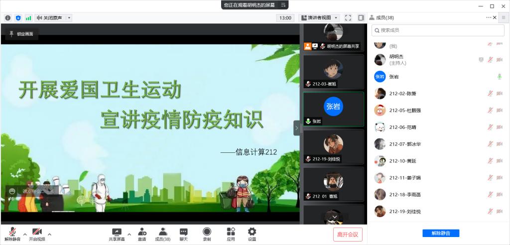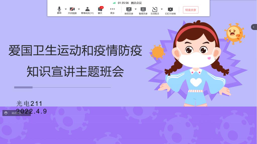 按照《关于莲湖校区学生公寓驻楼工作专班后续有关工作的通知》,2022年4月6日至4月10日,beat365各班级陆续召开了“爱国卫生运动及疫情防疫知识宣讲”线上主题班会。