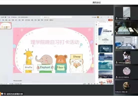 活动伊始,主持人向大家介绍了线上晚自习打卡活动的时间和活动流程,当晚7点活动准时开始,晚自习时同学们打开摄像头,进行线上打卡签到,互相监督学习情况和学习效率,在晚自习期间同学们积极自主地完成当天的作业并进行预习,大家的学习兴趣十分高涨,对这种新型的线上打卡活动也表现出了极大的认可。