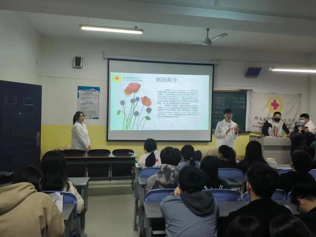 活动伊始,王祎锋介绍了本次活动的流程,乔靖钰、沈惠瀛向同学们介绍了心搏骤停的发病原因并介绍了心搏骤停时的应急救援方法——心肺复苏。在讲述心肺复苏的操作方式并回答了同学们提出的问题之后,乔靖钰和沈惠瀛进行了现场演示并邀请部分同学上台体验心肺复苏按压手法。随后,张文卓向同学介绍了有关包扎的相关知识和方法并邀请同学实地操作,活动现场气氛十分活跃。最后,沈惠瀛向同学们讲述了一些其他常见病症的应急救援方法并对本次活动进行了总结。