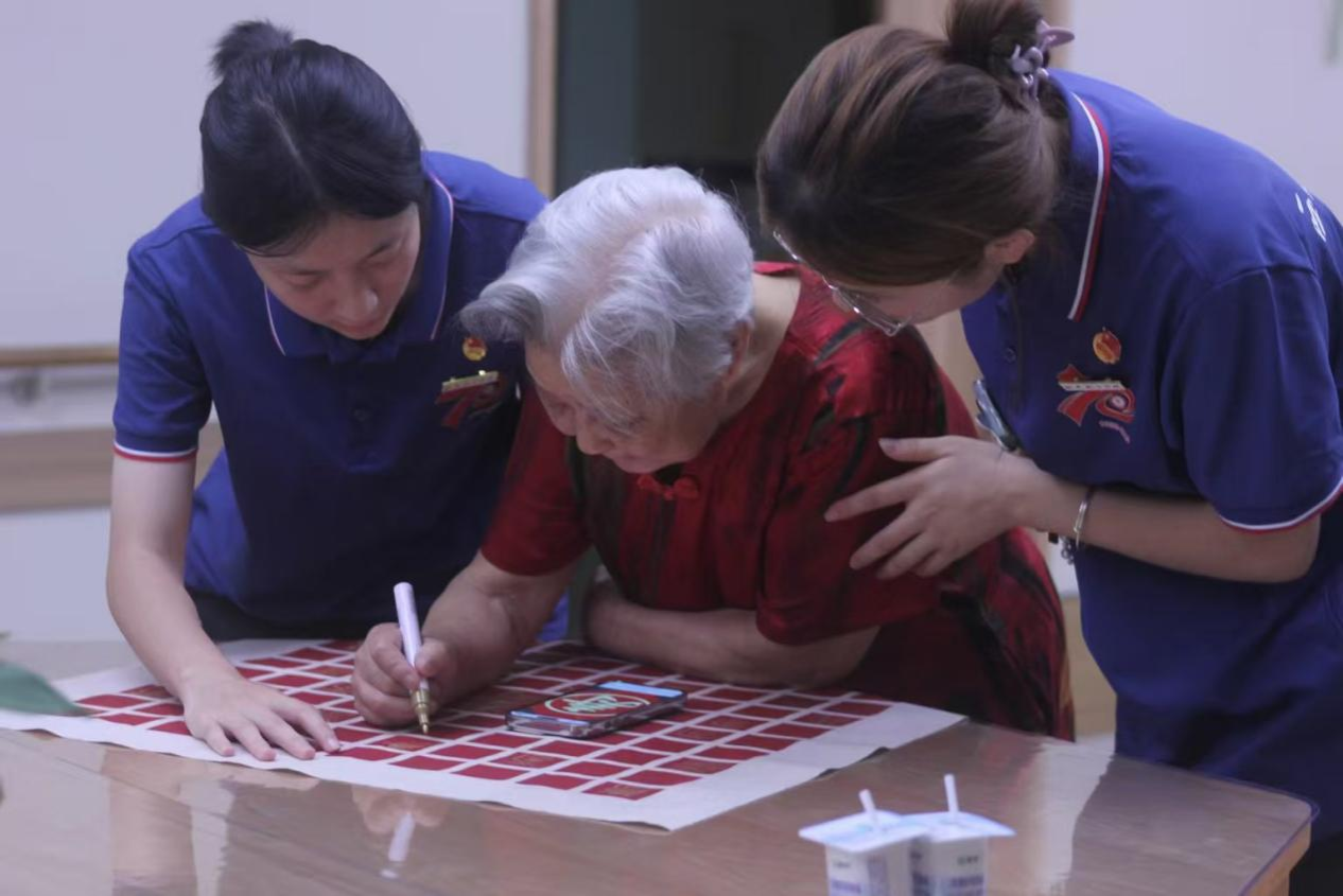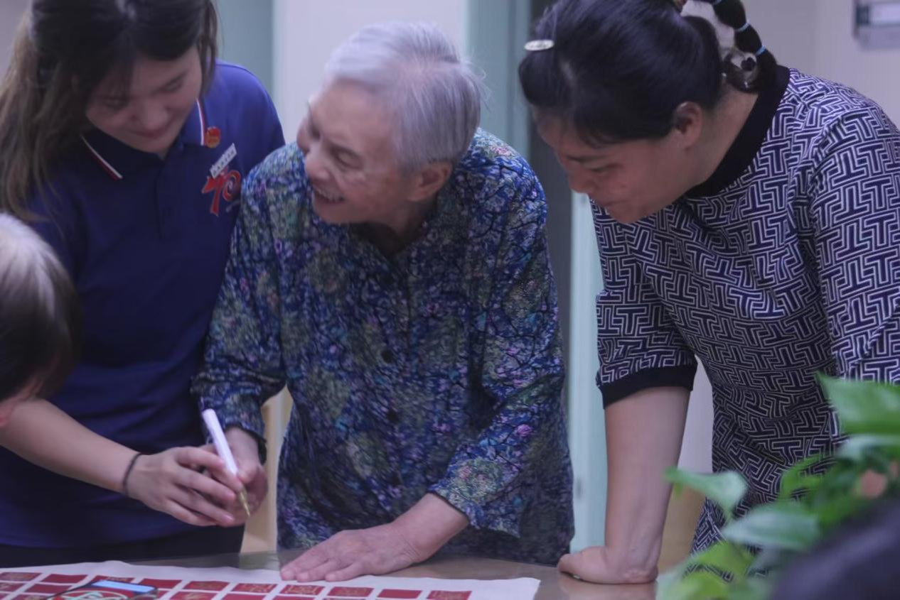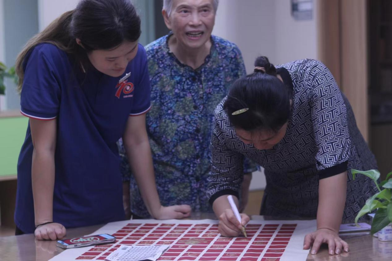 随着大家一个个在百寿图上写下“寿”字,整幅百寿图渐渐丰满起来篆隶楷行草各体皆有,或工整或洒脱,每一笔都带着书写者的温度。老人们和实践队队员围在百寿图前,指点着哪个字有气势,哪个字显秀气,眼里的光映着图上的笔迹,格外动人。“原本只是想让老人们多些乐子,没想到大家这么投入。” 照护中心负责人看着眼前的场景,语气里满是欣慰。实践队队员们也有同感,一位队员说:“和爷爷奶奶一起在百寿图上写字,感觉不是我们在付出,反而是他们让我们看到了对生活的热忱。”