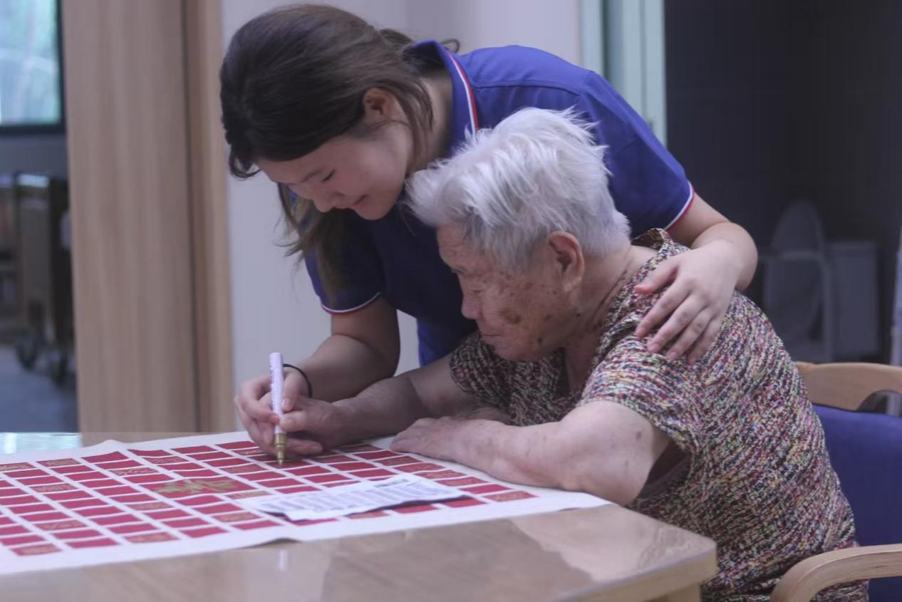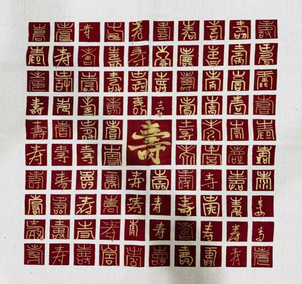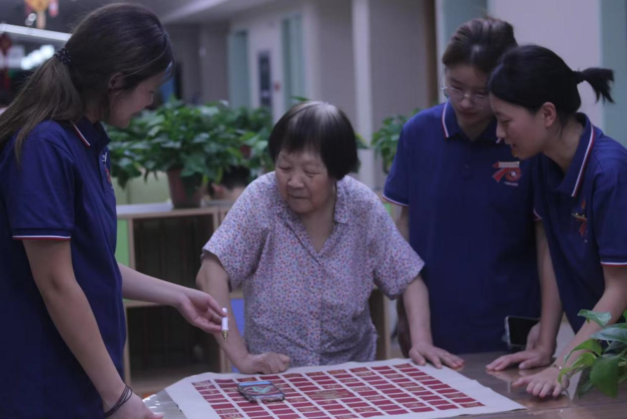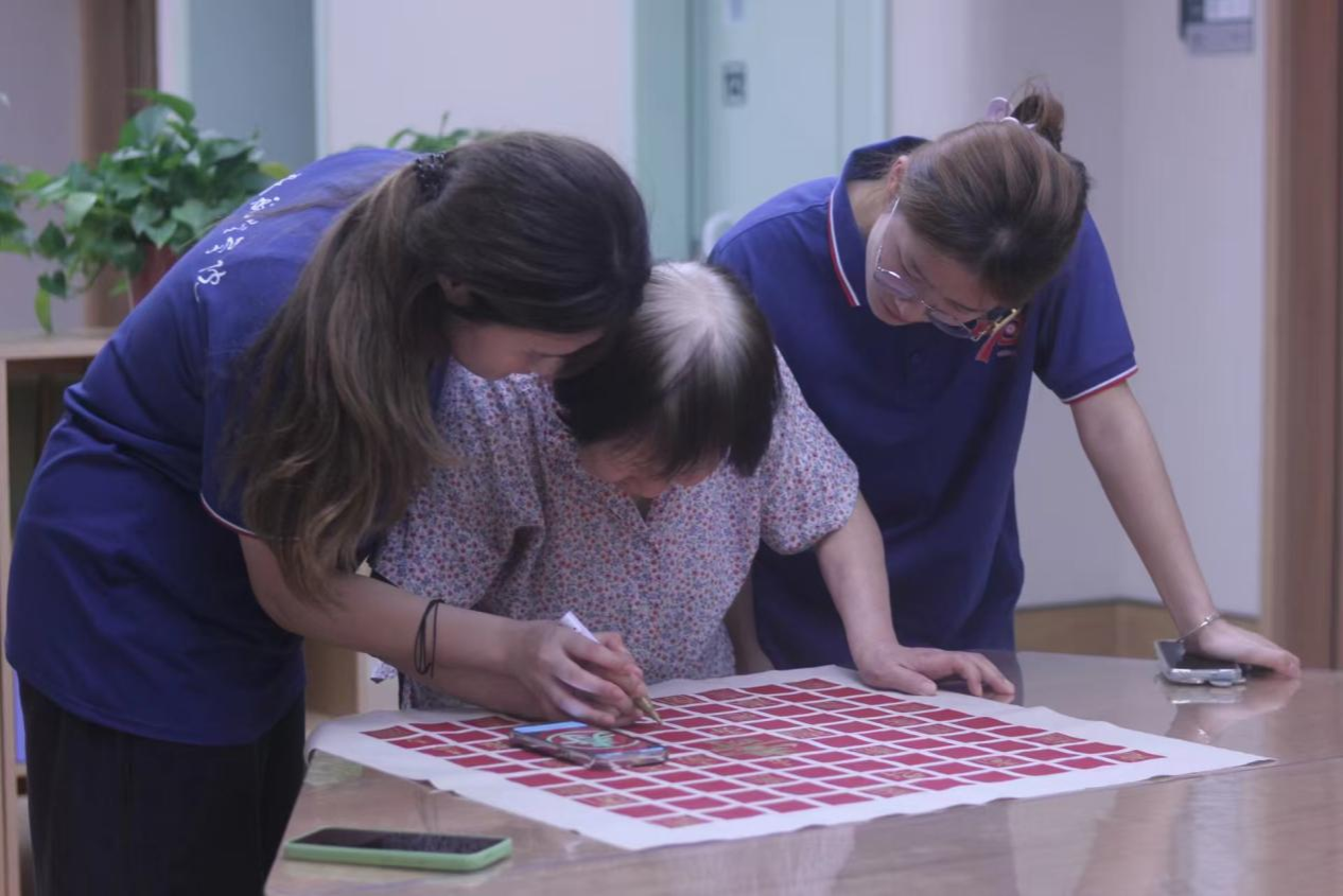 随着大家一个个在百寿图上写下“寿”字,整幅百寿图渐渐丰满起来篆隶楷行草各体皆有,或工整或洒脱,每一笔都带着书写者的温度。老人们和实践队队员围在百寿图前,指点着哪个字有气势,哪个字显秀气,眼里的光映着图上的笔迹,格外动人。“原本只是想让老人们多些乐子,没想到大家这么投入。” 照护中心负责人看着眼前的场景,语气里满是欣慰。实践队队员们也有同感,一位队员说:“和爷爷奶奶一起在百寿图上写字,感觉不是我们在付出,反而是他们让我们看到了对生活的热忱。”