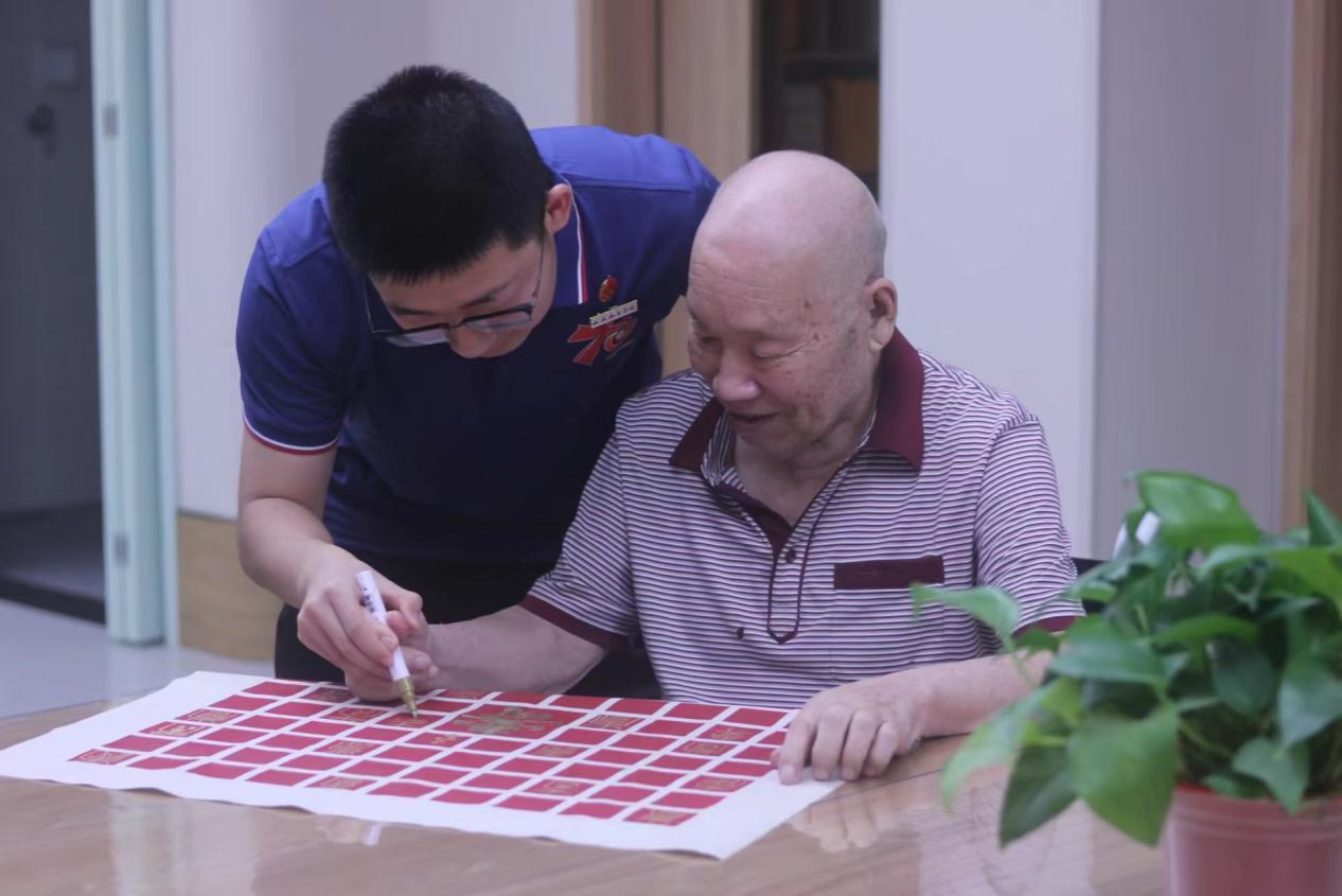 活动现场,志愿者们精心准备,将“寿”字书法跨越千年的演变娓娓道来。青年与银龄并肩执笔,共同在百寿图上挥毫。一位老人腰背挺直,挥毫泼墨间,筋骨遒劲的“寿”字跃然纸上,引来赞叹;邻座奶奶略显迟疑,身旁的志愿者小雒轻轻握住她的手,在纸上游走,笔迹渐成,老人的紧张化作了释然的笑容:“多少年没碰过这个了,有你带着,我也能写出来啦!”95岁的爷爷轻抚刚完成的墨宝,感慨道:“年轻时在学堂练过,后来放下了,这一写,记忆都回来了。”一位白发奶奶端详着自己的作品,眼中闪烁着孩童般的得意:“这个,可比刚才的好多了吧?”老人们的专注、感慨与自豪,在笔墨间流淌