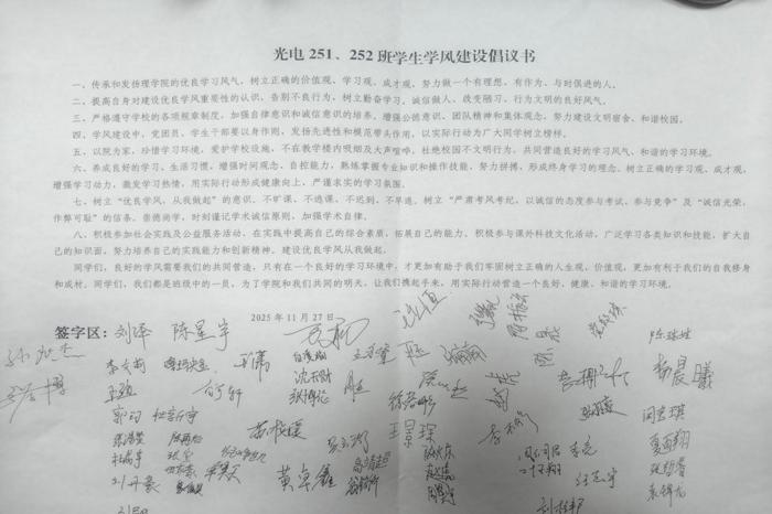 李扬宣读了光电信息251、252班学生学风建设倡议书,参会同学们庄重地在倡议书上签上了自己的姓名,纷纷表示要好好学习,诚信考试,维护班级荣誉。