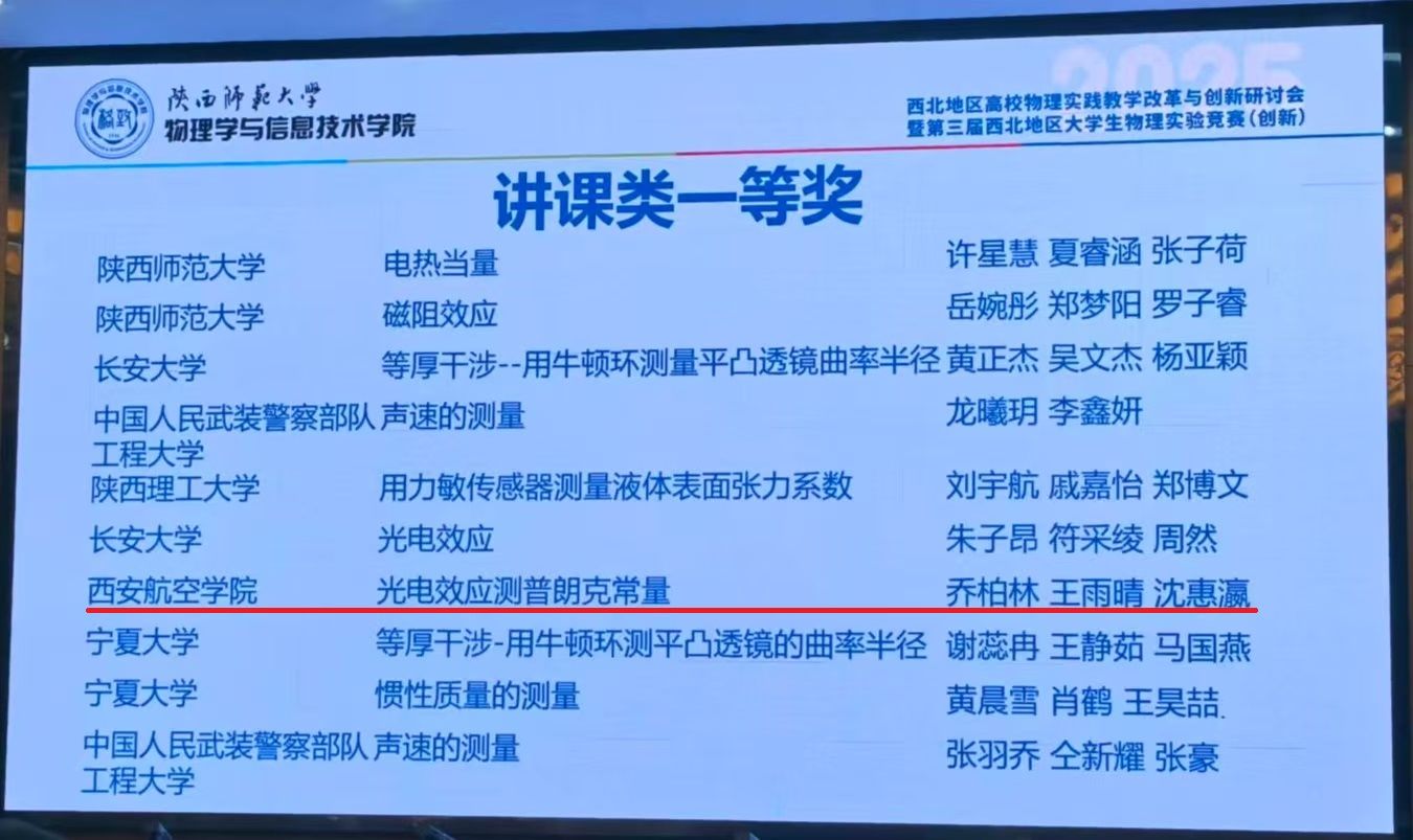 2025年全国大学生物理实验竞赛(创新)西北地区竞赛于近日在陕西西安落下帷幕,本次竞赛由全国大学生物理实验竞赛组委会西北地区分委员会主办,陕西师范大学与西安交通大学承办,来自59所学校的536支队伍参与竞赛。经过校内选拔,我校推荐的8支队伍参加了本次比赛。经过初赛与决赛的激烈角逐,8支队伍获得一等奖1项、三等奖4项,优秀奖3项。