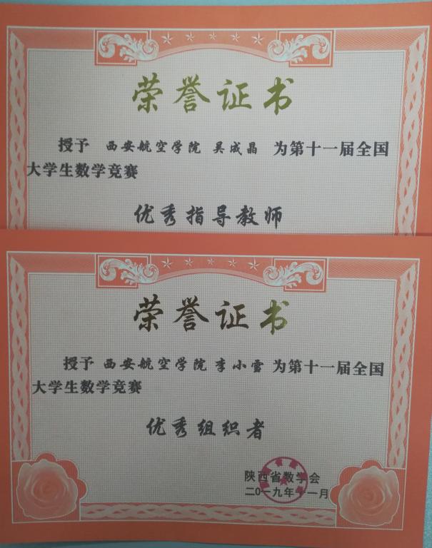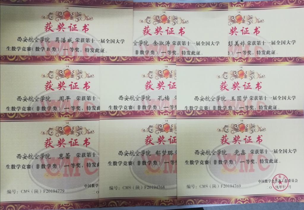 2019年第十一届全国大学生数学竞赛成绩揭晓,我校共获82项奖项,其中陕西省一等奖17项、二等奖30项、三等奖35项,其中数学类获省级一等奖1项,省级二等奖1项,省级三等奖3项,本次竞赛是我校第四次参赛,也是历年来参加人数和获奖人数最多的一次。
